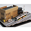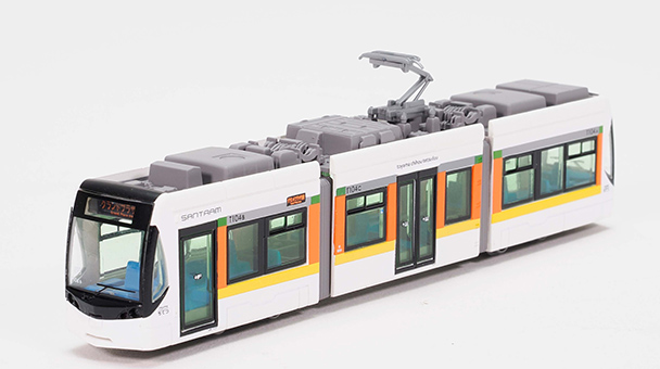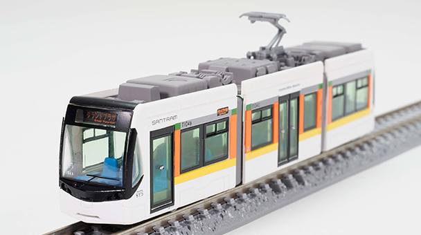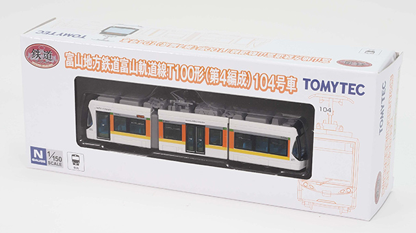 富山地方鉄道軌道線は、富山駅を中心に南北に渡り路線網を広げています。 2020年3月21日には南北接続運転を開始し、富山市民の日常の足として、また通勤・通学や観光客の移動手段としても活躍しています。 2010年から2017年までに合計4編成が導入されたT100形は、サントラムという愛称で親しまれ、輸送力の大きい3連接車体が特徴です。 104号車はサントラムの第4編成として2017年に導入された車両で、導入時はオレンジを基調としたデザインに窓下に黄色のラインを配色したカラーリングが採用されました。