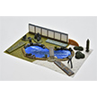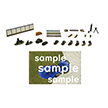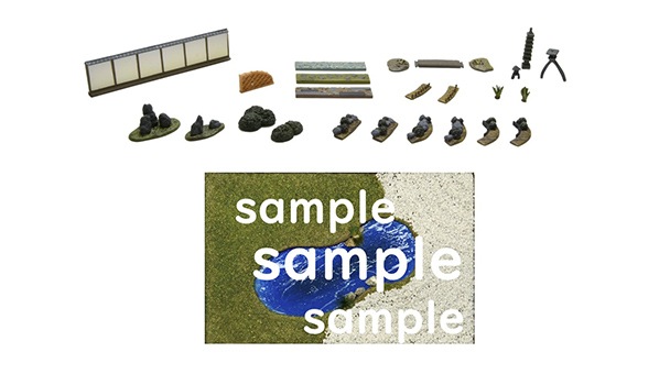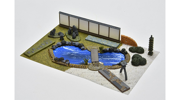 セット内容: 土塀、竹垣、小橋、生垣、菖蒲、石畳、池の淵4種×各2、石灯籠、庭石、ジオラマシート レイアウトサイズ: W125×H25×D80(㎜)