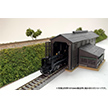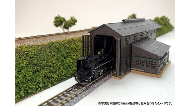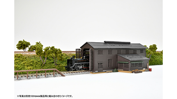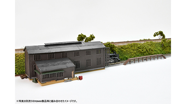セット内容: 電車庫、作業所、洗車台、小物(ドラム缶、金属ごみ置き場等) 本体サイズ(電車庫1個あたり): W155×H60×D45(㎜)